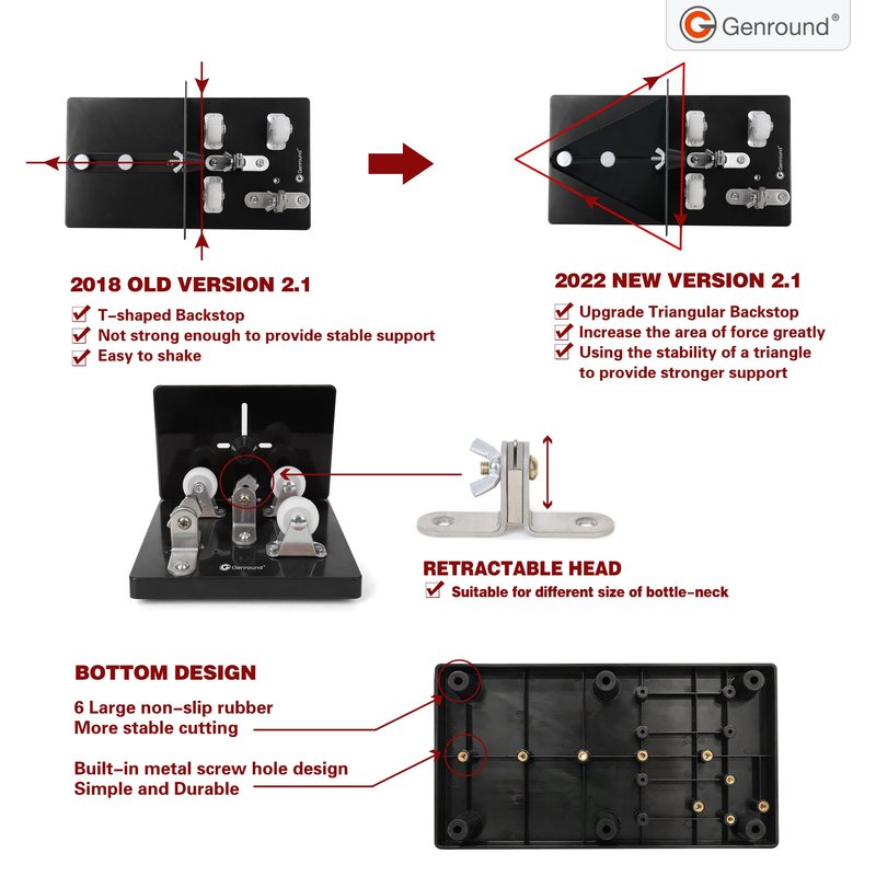 - 【Reinforced Support Panel for More Stable Cut】 We've upgraded Genround 2.1 bottle cutter with reinforced panel, providing a more stable support for glass cutting. It's difficult to bend or shake when you press the bottle against it, making it easy to score a complete circle and create a clean cut.