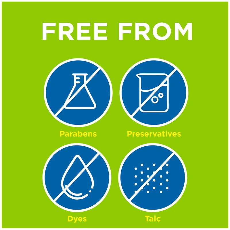 - Free from dyes, preservatives, parabens and talc