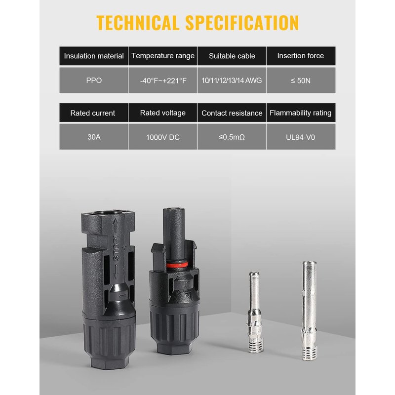 - 【Package Included】6 pairs solar panel connectors Male & Female + 6 pairs solar connector pins (male & female) + 1 pair of spanners