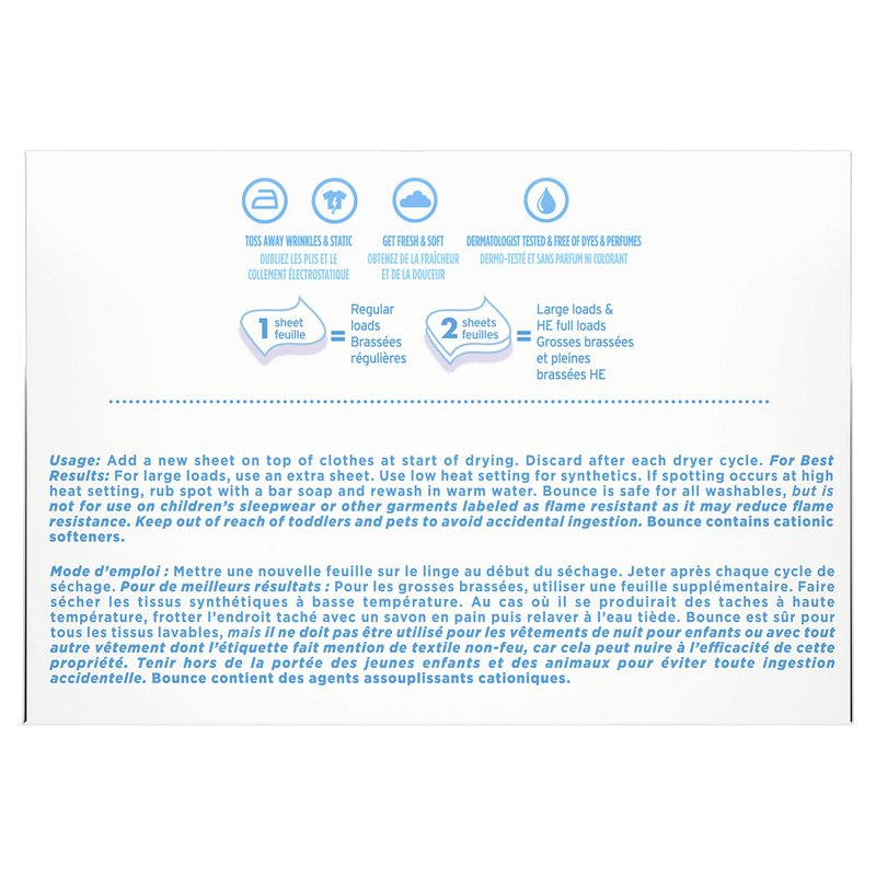 - Toss in two Bounce dryer sheets for your average loads to iron less, fight more static, repel more lint & pet hair, and add more softness. For small & medium loads toss in one Bounce dryer sheet, and for extra-large loads toss in three!