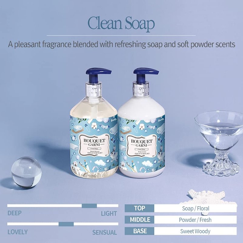 Bouquet Garni Body Lotion Clean Soap - Long Lasting Deep Moisturizing Scented Lotion - Calming Ingredients Lotus Flower Extract - Shea Butter Rich in Vitamin A, C, E - Non Sticky Texture - 17.6 Fl Oz