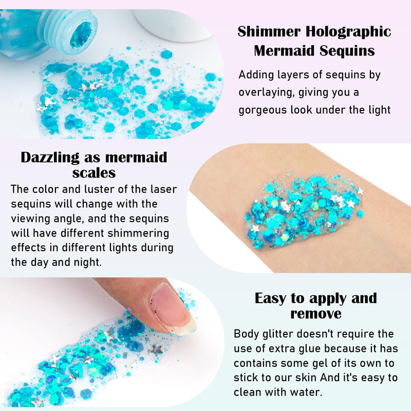 - 【Holographic Mermaid Sequins】The color and shine of the laser sequins in our blue body glitter will change with the viewing angle, and the sequins will have different shimmering effects in different lights during the day and night.Our pink glitter can as barbie accessories for women and you can creat a dazzling makeup as mermaid scales with our glitter makeup.