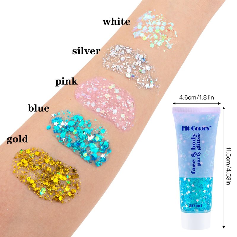 - 【Multi-color face glitter】Our body glitter gel contains 5 colors of face glitter, there are white glitter, pink glitter, blue glitter, gold glitter and silver glitter, you can choose your favorite color to mix to create the perfect glitter makeup look for yourself, or you can use it as a body glitter or a hair accessory to create a shimmering effect.
