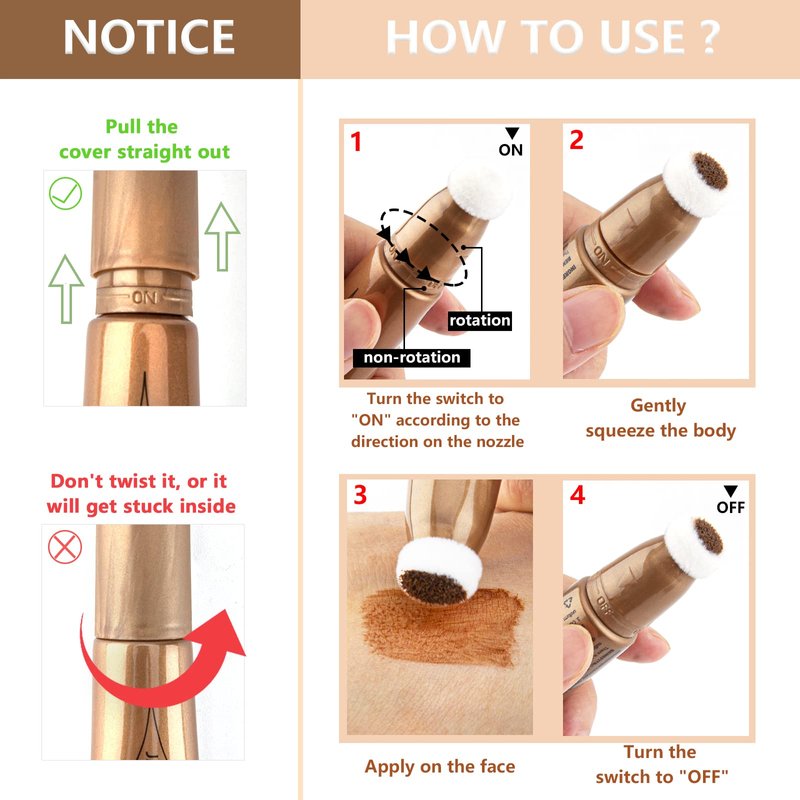 - 【How to Use】1. Pull the cap straight out (don't twist it, or it will get stuck inside) 2. Turn the switch to "ON" according to the direction on the nozzle. 3. Gently squeeze the tube to dispense an appropriate amount of cream and lock the liquid through the air cushion applicator, and turn the switch to "OFF". 4 Apply the bronzer cream to desired locations and blend with fingertips or a brush.