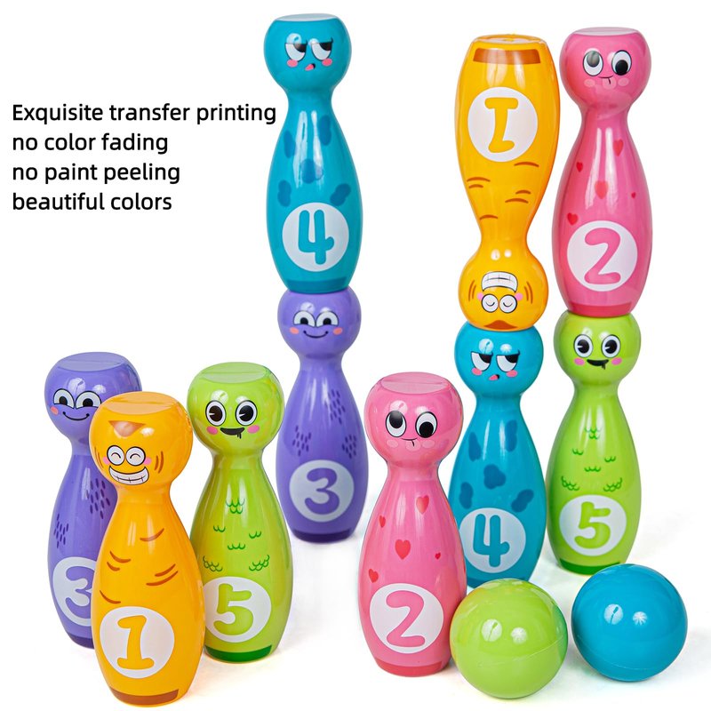 - Toys are suitable for family gatherings, indoor games, and diverse bowling styles. Flat top bottles can be stacked for more fun and can exercise children's hand eye coordination skills. This is a bowling toy made in China