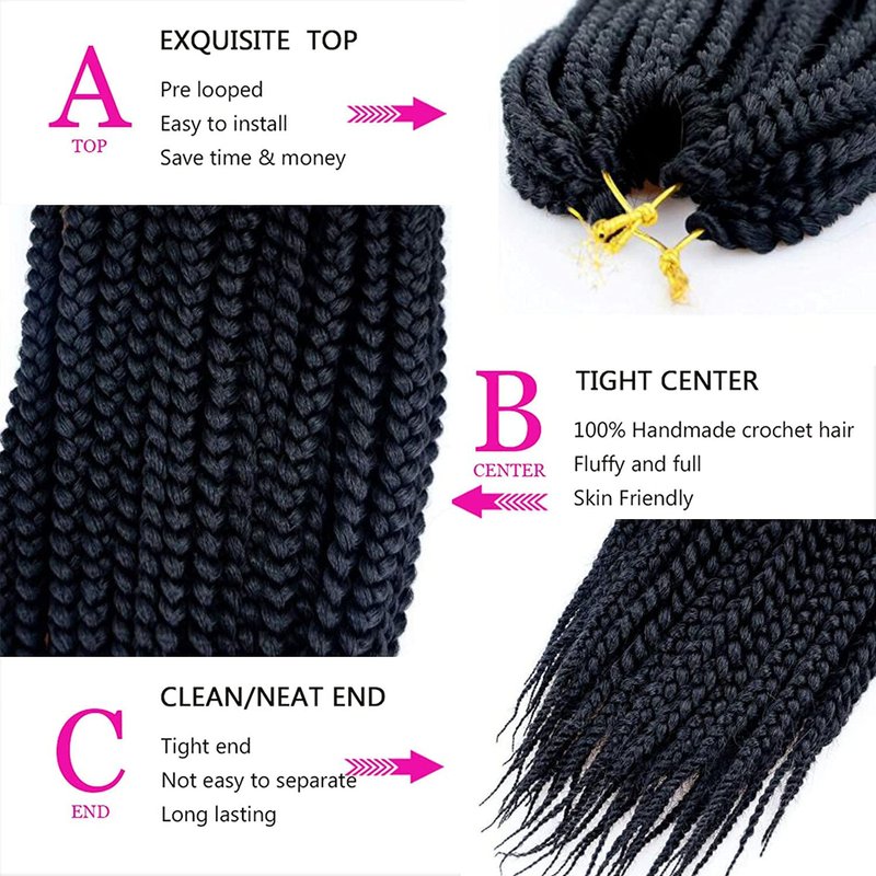 - ❤️💛💚💙❤️1.Hair Material: Box Braids Crochet Hair Crochet Box Braids Hair Box Braid Crochet Hair Crochet Braids Box Braiding Hair is made of Premium Quality Kanekalon Synthetic Fiber,100% Kanekalon Synthetic Hair, Low Temperature Synthetic Fiber Hair.