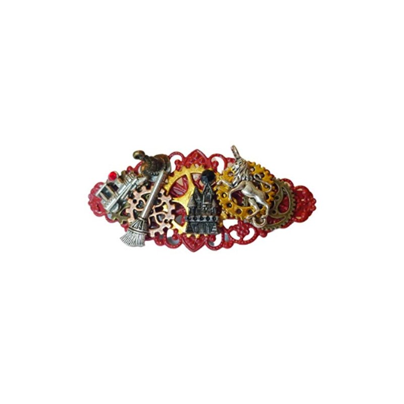 Fans of the Boy Wizard will love this Steampunk Hair Clip Barrette in red and gold, like his favorite house. The charms include an Express train, Magical broom, Castle, Wizard cap and lion on Metal gears with a Red base. Brass clip is 3 inches long with a french clip. IF you are interested in a CUSTOM hair clip on another theme, please just ask!!