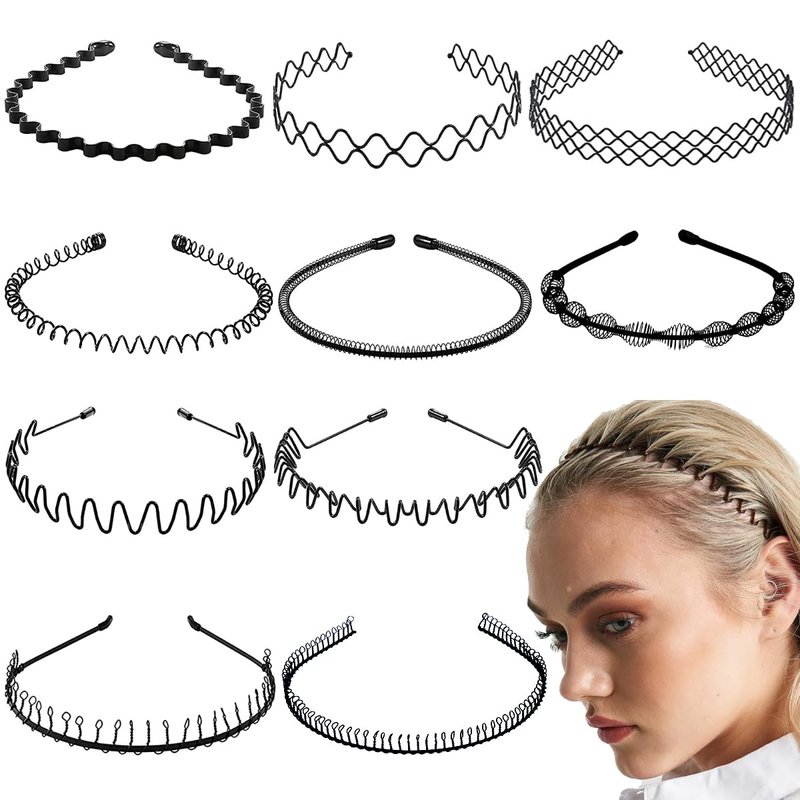 BOYIVI 10 PCS Metal Hair Band for Men Women Black Wavy Headband Non-slip Unisex Hairband Fashion Sports Outdoor Hair Hoop Simple Elastic Hair Accessories