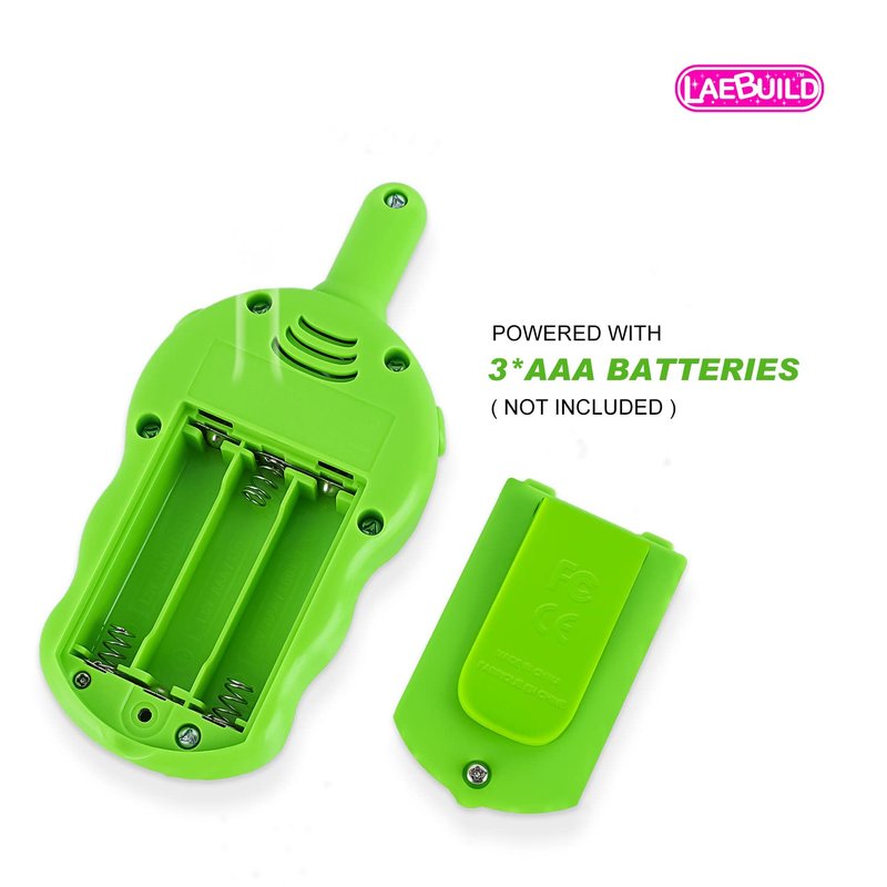 LAEBUILD is dedicated to providing the highest quality design and development of safe, family fun and educational electronic toys. "Walkie-talkie friends" can be widely used for various indoor and outdoor occasions, such as hiking, family vacations and activites, shopping malls, hotels, travel, spring/summer outings and camping trips. Family fun anywhere, anytime, any place! With "Walkie-talkie friends” you can always keep in touch with the children at all times and protect children’s safety in crowed places. HOW TO OPERATE YOUR WALKIE TALKIE 1. Open battery cover and snap in 3 AAA batteries (Not included) 2. Turn the ON/OFF" switch to "ON" position. Your transceiver is now ready to operate 3. Press the TALK BUTTON switch for transmitting. Release the switch for receiving.