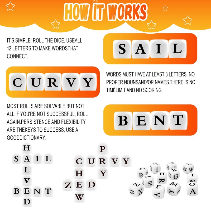 Hey, welcome to the super-fun Word Game! There are 12PCS dice, and this manual will guide you through the rules, game play, and special features of this unique anagram challenge.