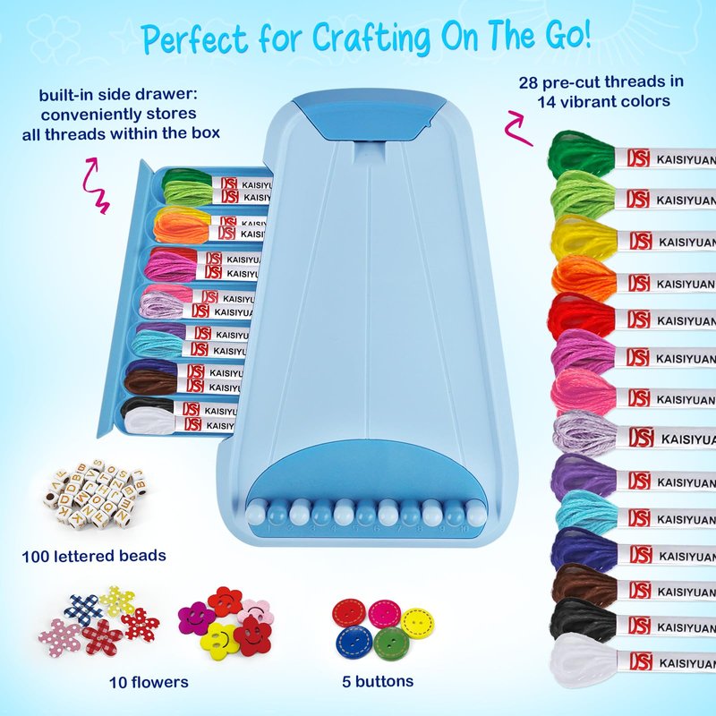 - Portable and Comprehensive Bracelet Making Kit for On-the-Go Crafting: Keep everything organized with the built-in side drawer, which conveniently stores all 28 pre-cut colorful threads in 14 vibrant colors. This kit also includes 100 letter beads, 15 buttons, and 5 anti-slip pads to keep your bracelet making kit stable. Create unique bracelets anywhere you go! Perfect for all ages