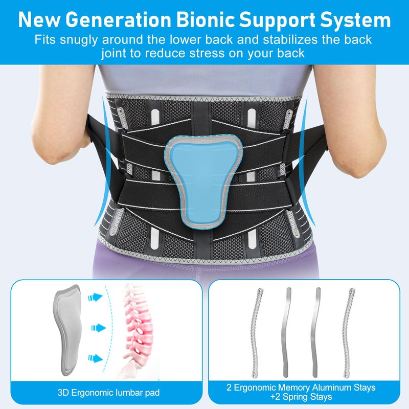 - ใ๐ง๐ต๐ฒ ๐ฆ๐๐ฟ๐ผ๐ป๐ด๐ฒ๐๐ ๐ฆ๐๐ฝ๐ฝ๐ผ๐ฟ๐ ๐ฎ๐ป๐ฑ ๐ฆ๐๐ฎ๐ฏ๐ถ๐น๐ถ๐๐ใOur lumbar brace belt adopts a new generation of ergonomic support system (1 x 3D bionic lumbar pad + 2 bionic memory aluminum braces + 2 elastic springs), whose overall support strength is twice as strong as that of ordinary back support, which dramatically improves the curvature of the spine and reduces the stress on the spinal structure, while keeping your torso in a safe and supportive position to protect your lumbar vertebrae to prevent further injury.