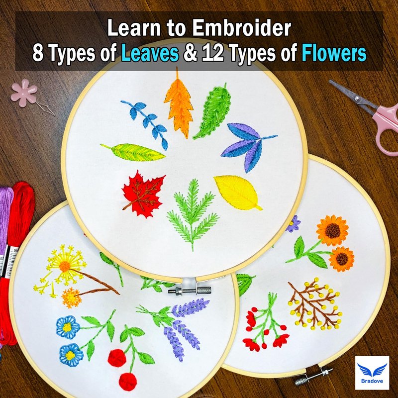Bradove 3 Sets Leaves and Flowers Embroidery Practice Kit, Embroidery Kit for Beginners Adults, Learn to Embroider Kit Adult Beginner, Embroidery Practice Stitches Kit, Beginner Embroidery Kit
