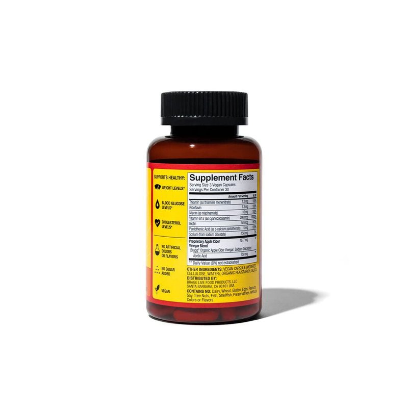 Bragg True Energy Apple Cider Vinegar Capsules. Made with Bragg Apple Cider Vinegar plus six essential B Vitamins, each capsule supports a steady flow of energy at the cellular level. Unlike stimulants, this potent formulation delivers fuel to your cells, powering them to be more efficient, so you feel stronger and ready to take on your day. Non-GMO Verified, Vegan, Sugar-Free and Gluten-Free Health Benefits of Bragg Apple Cider Vinegar: Helps generate energy at the cellular level control appetite and manage weight gain, and supports a healthy immune system. Bragg Apple Cider Vinegar Capsules are selling quickly! Buy yours while supplies last!