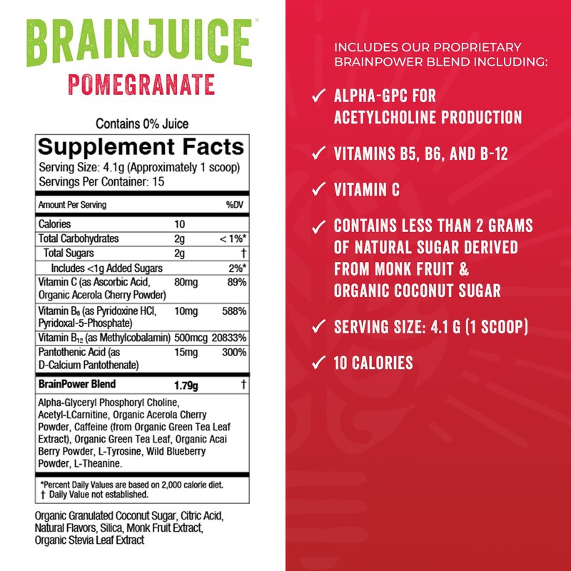 - DELICIOUS FLAVOR: Our Pomegranate BrainJuice powder is a delicious fall flavor that can be enjoyed year round. Each serving delivers a nutrient boost for your brain health. Delicious to use as a smoothie mix, pre workout, in water, your favorite tea or morning beverage!