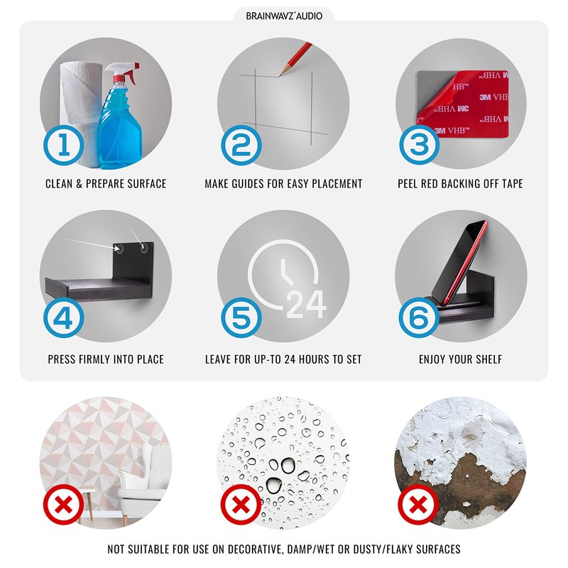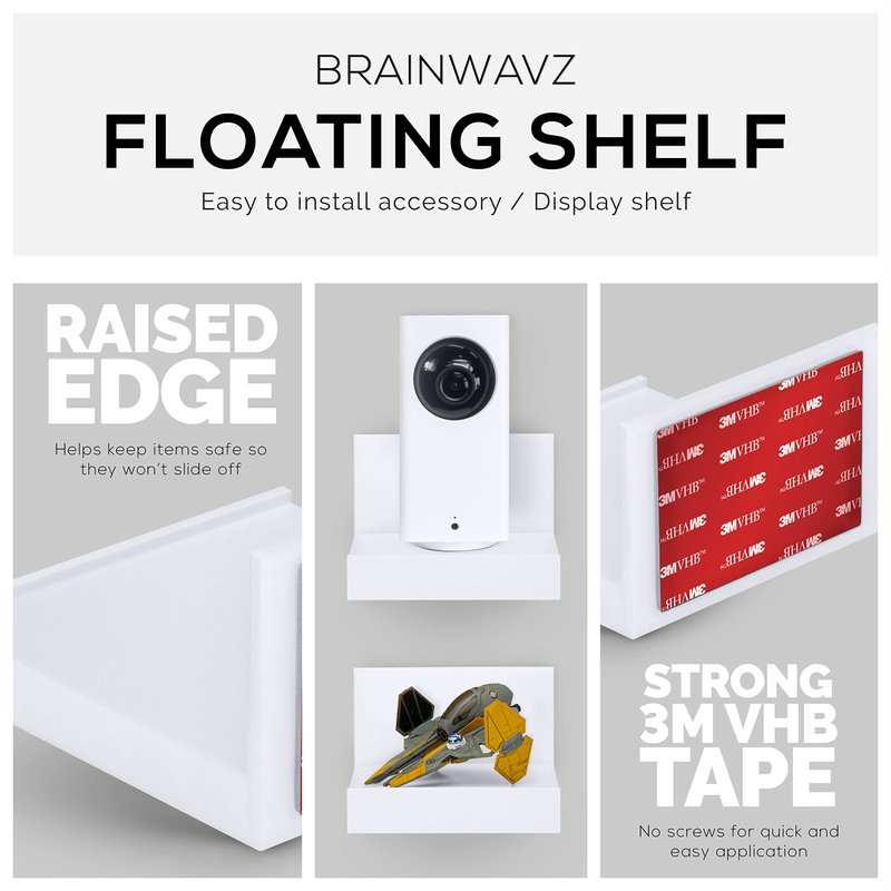 - 3M VHB STRONG TAPE: Brainwavz floating shelves are simple to hang with no tools or screws required. We use only the best 3M VHB tape to mount the shelves on a variety of surfaces.