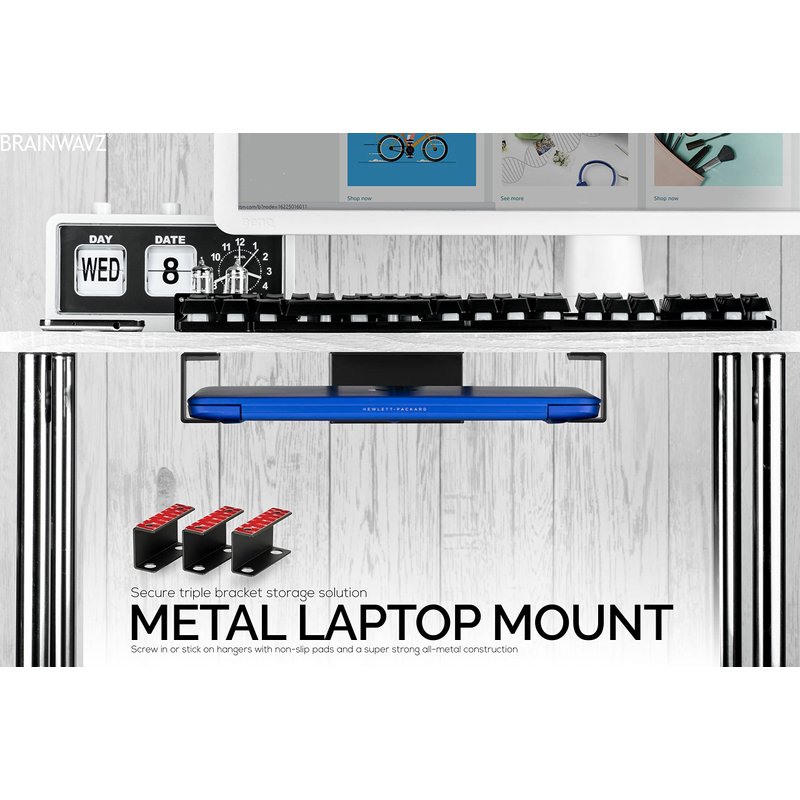 BRAINWAVZ Under Desk Laptop Holder Mount for Desk, Adhesive & Screw in, Devices Upto 1.5" Thick Like Macbooks, Surface, Keyboard, Routers, Modems, Cable Box, Network Switch & More (Metal Black)
