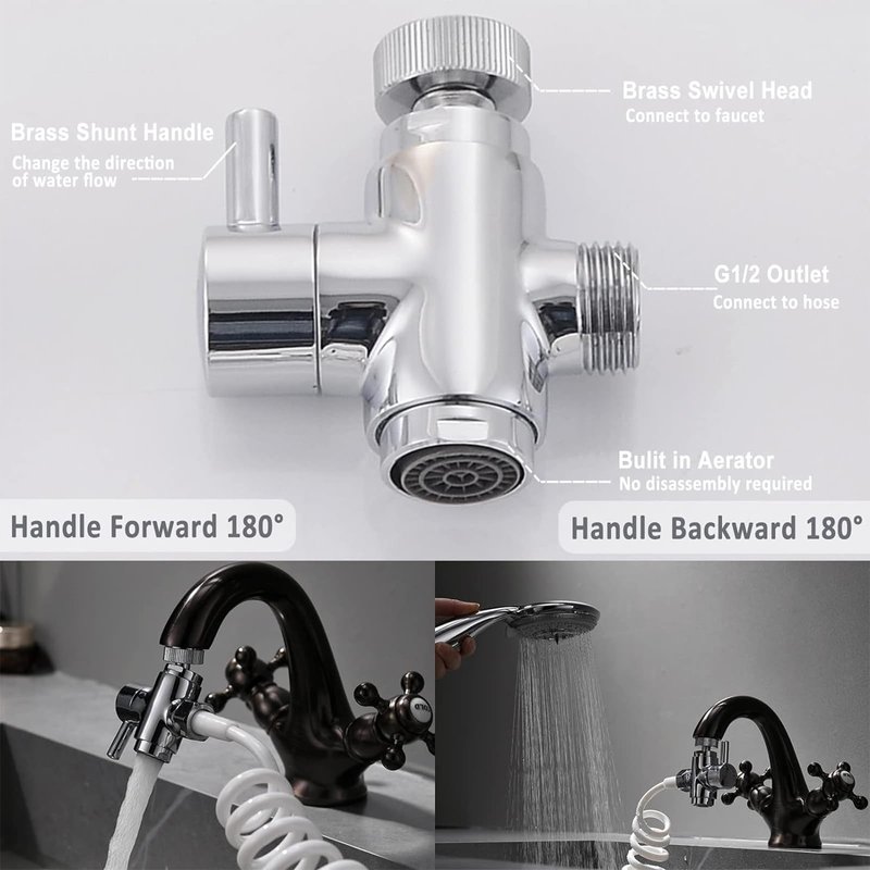 - [3 Way Diverter Valve]: Sink faucet diverter directs faucet flow to faucet aerator or G1/2 male thread. No disassembly required for each use, the metal handle turns smoothly between the aerator and the G1/2 outlet.