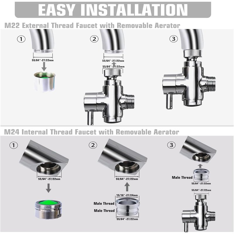 - [Universal Connection Size]: Faucet splitter has 55/64”-27 female thread (22mm) fit 55/64”-27 male faucet (22mm). Additional male adapter 15/16"-27T to 55/64"-27T (24mm to 22mm) for 15/16" female faucet (24mm).