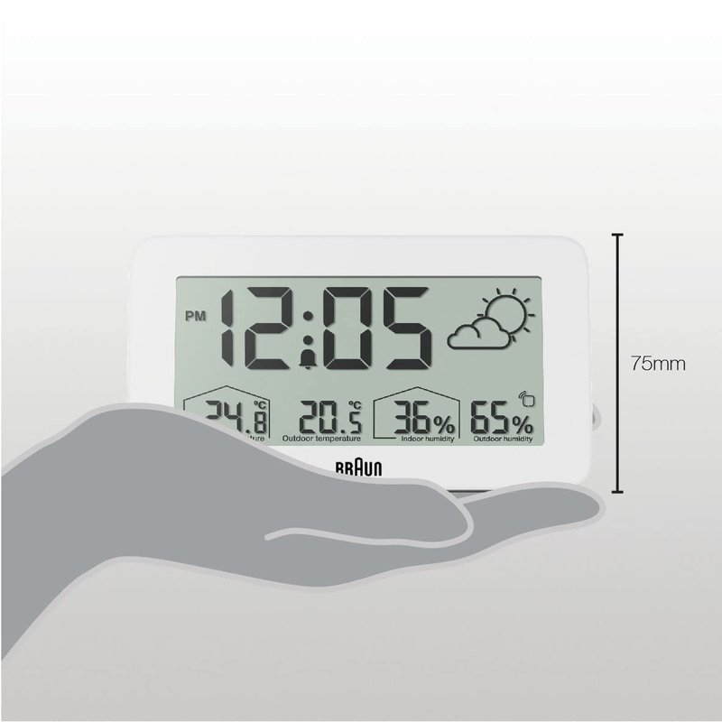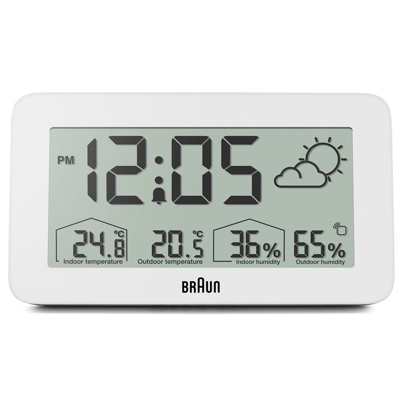 Braun Digital Weather Station Clock with Indoor and Outdoor Temperature and Humidity, Forecast, LCD Display, Quick-Set, Crescendo beep Alarm in White, Model BC13WP.