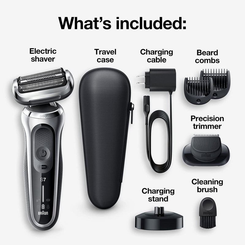 - WHATS IN THE BOX: Series 7 electric razor; 6 trimmer attachments, travel case, charging stand, cleaning brush, charging cord, and user manual.