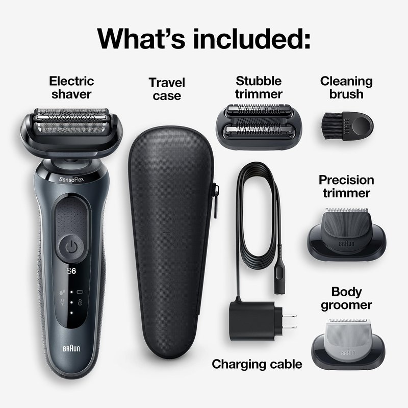 - WHATS IN THE BOX: Series 6 electric razor; 3 additional trimmer attachments, travel case, charging stand, cleaning brush, charging cord, and user manual