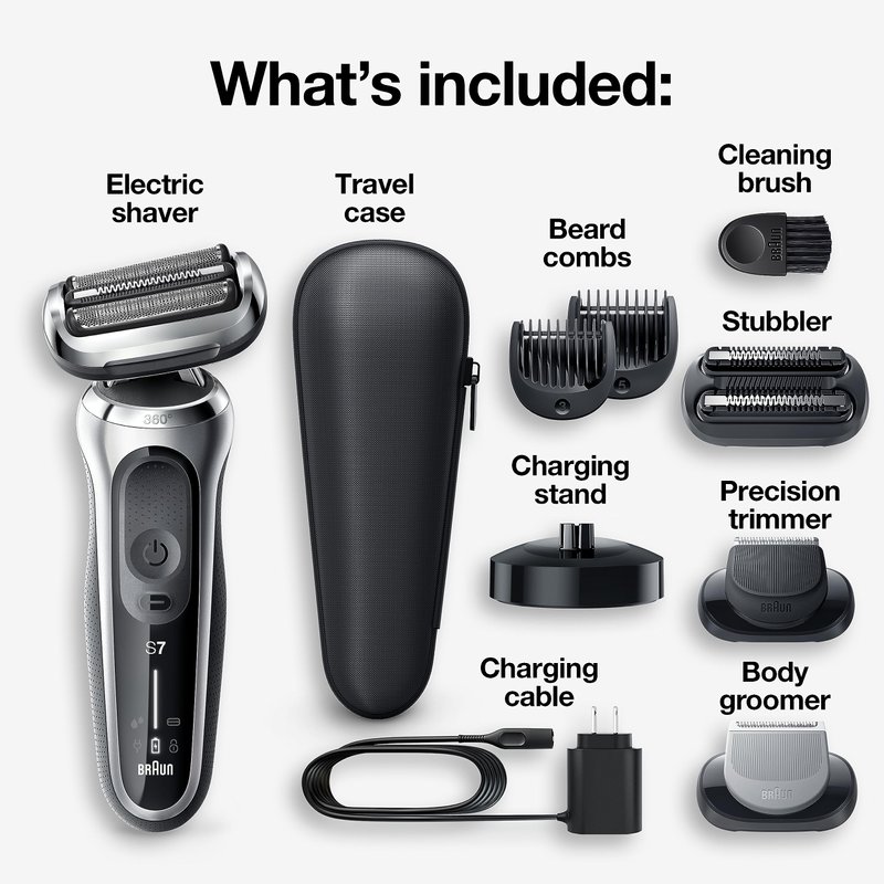 - WHATS IN THE BOX: Series 7 electric razor; 5 additional trimmer attachments, travel case, charging stand, cleaning brush, charging cord, and user manual