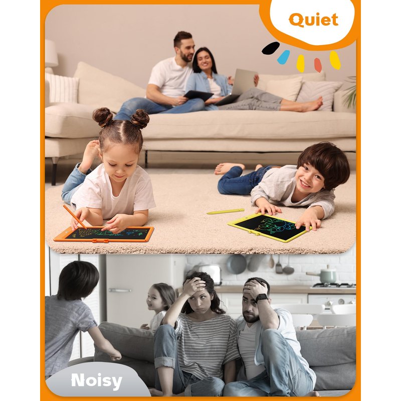 - PORTABLE AND DURABLE: The drawing board for kids is made of durable plastic, plus round corner design, anti-fall and anti-shock, no need to worry kids drop it. The drawing tablet weights only 150 grams, easy to carry, place in school bags, handbags, travel bags. The doodle board also can be used in multiple places: airplane, car, restaurant, sofa, etc.