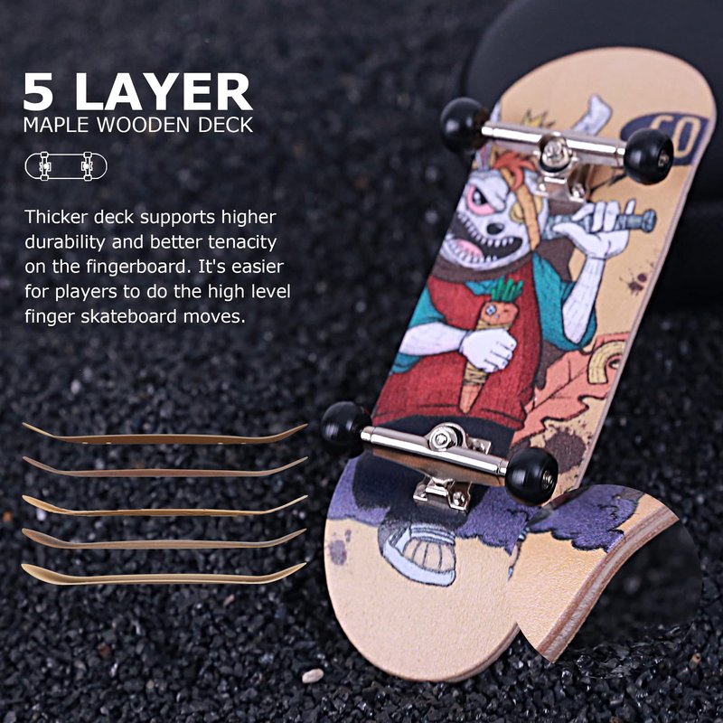 - CLASSIC & FASHION: BRAVORD finger board are available in two different styles. The Classic Maple style (34mm) is made of 5-ply Canadian maple and it has a wooden handboard texture on the top and back side. The M-King style (32mm) is made of 5-ply maple and it has a fashion graphic design on the back of the finger skate board.