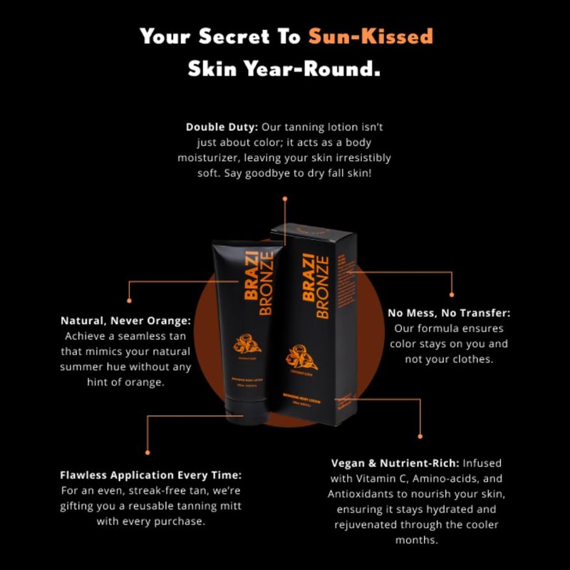 - VEGAN & CRUELTY-FREE COMMITMENT: Animals are our friends! That's why Brazi Bronze self tanning lotion is never tested on animals. It's also Non-GMO, Vegan, and Non-Toxic. It's the best self tanner for your body and our Mother Earth.