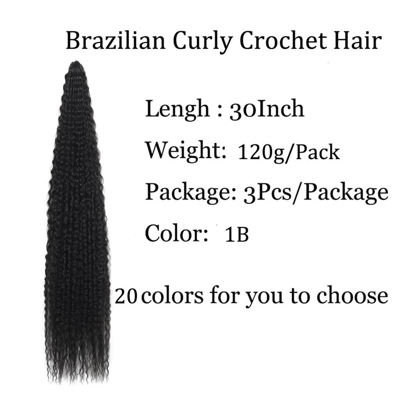 Brazilian Curly Crochet Braiding Hair Name : Brazilian Curly Braids Crochet Twist Hair 30inches 3Packs Afro Kinky Curly Braiding Hair Extensions Deep Curly Crochet Hair Synthetic Brazilian Water Wave Braid Hair(30Inch,1B) Afro Kinky Curly Crochet Hair Material: High Quality Synthetic Fiber, Smoot hand Soft , Tangle-free, Light Weight, Durable , long lasting, Comfortable to Wear, Easy to wash and care Close to real hair. Brazilian Curly Braiding Hair Extensions Size&Weight : 30 Inch 120±5g/Pack Water Wave Braiding Hair Color: Black,2#,4#,27#,30#,350#,613#,Light Black , Blond ,Brown ,Red Brown ,Beige ,Light Blue,Dark Blue,Burgundy,Green,Grey,Orange,Pink,Red, 99j,silver,1b/27,1b/30,1b/bug,1b/red,1b/silver. Curly Wave Crochet Hair Package Includes: 3 Packs Brazilian Curly Crochet hair extensions ,Usually 3-6 packs can make a full head , if you want to look very full, please buy 6 packs. Water Wave Crochet Hair can not only spread shawls, but also braid or tie up. According to your preference, the hairstyle effect is very good, making you more beautiful.