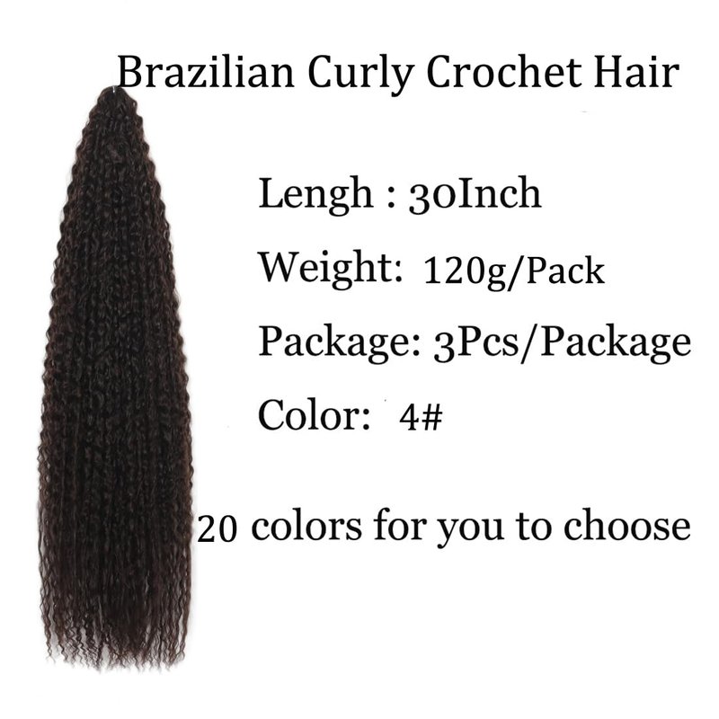 Brazilian Curly Crochet Braiding Hair Name : Brazilian Curly Braids Crochet Twist Hair 30inches 3Packs Afro Kinky Curly Braiding Hair Extensions Deep Curly Crochet Hair Synthetic Brazilian Water Wave Braid Hair(30Inch,1B) Afro Kinky Curly Crochet Hair Material: High Quality Synthetic Fiber, Smoot hand Soft , Tangle-free, Light Weight, Durable , long lasting, Comfortable to Wear, Easy to wash and care Close to real hair. Brazilian Curly Braiding Hair Extensions Size&Weight : 30 Inch 120±5g/Pack Water Wave Braiding Hair Color: Black,2#,4#,27#,30#,350#,613#,Light Black , Blond ,Brown ,Red Brown ,Beige ,Light Blue,Dark Blue,Burgundy,Green,Grey,Orange,Pink,Red, 99j,silver,1b/27,1b/30,1b/bug,1b/red,1b/silver. Curly Wave Crochet Hair Package Includes: 3 Packs Brazilian Curly Crochet hair extensions ,Usually 3-6 packs can make a full head , if you want to look very full, please buy 6 packs. Water Wave Crochet Hair can not only spread shawls, but also braid or tie up. According to your preference, the hairstyle effect is very good, making you more beautiful.