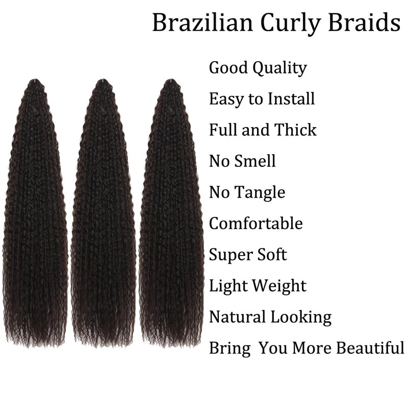 - 1. Brazilian Curly Braiding Hair Material : Curly Braiding Hair is Made of High-Temperature Synthetic Fibers. Smooth,Tangle-Free,Soft,Light Weight,Soft as Human Hair. Quick to Install, Cut short,Braid & Easy Style to Shawl Hair, Braided Hair, Ponytail, etc. According to Your Preference.