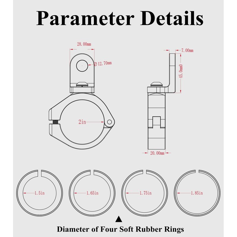 - Kit comes with four sizes of rubber ring inserts to provide a snug fit and protect the mounting surface. Rubber ring diameters: 1.5" (38.1mm), 1.65" (41.91mm), 1.75" (44.45mm), 1.85" (46.99mm). The rubber ring can be increased or decreased according to the diameter of the round rails. The tube clamp have a 2" (50.8mm) diameter mounting hole when without the rubber ring insert