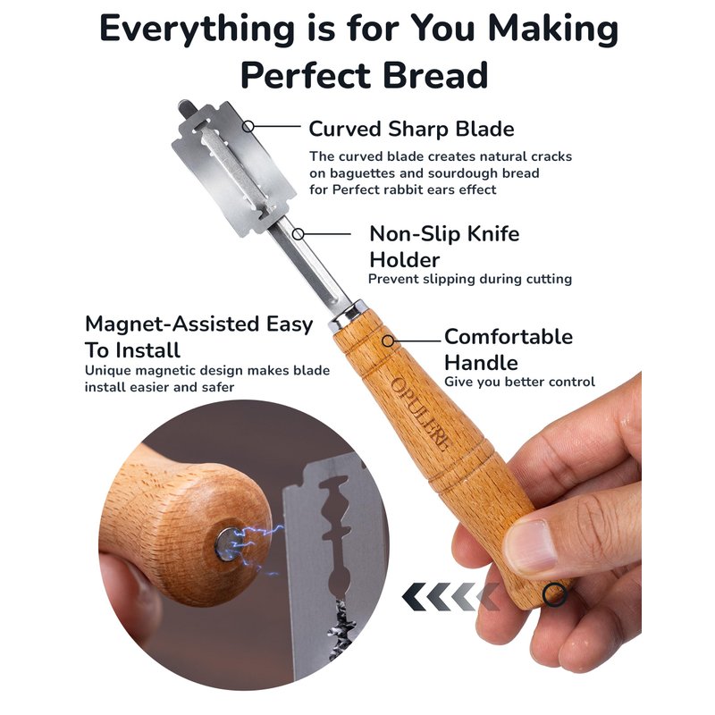 - Say Goodbye to Bread Lame Blades Installation Fears: The magnetic design under the wooden handle makes assembly a breeze. Finger protectors ensure safety during blade replacement. Plus, we’ve included a step-by-step bread scoring tool install video to help you