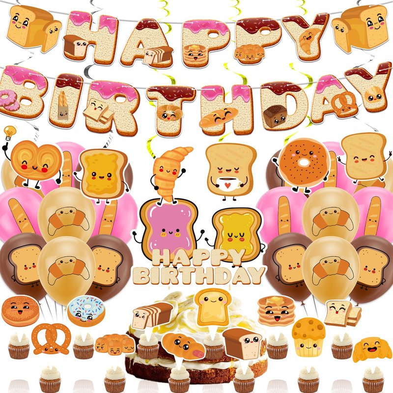 - Bread Birthday Party Supplies: Package includes 1* bread HAPPY BIRTHDAY banner, 1* toast bread HAPPY BIRTHDAY cake topper, 6* toast bread hanging swirls, 12* bread cupcake toppers, 18* bread balloons, 1* ribbon. Sufficient quantity to add surprises to your family and friends at the party.