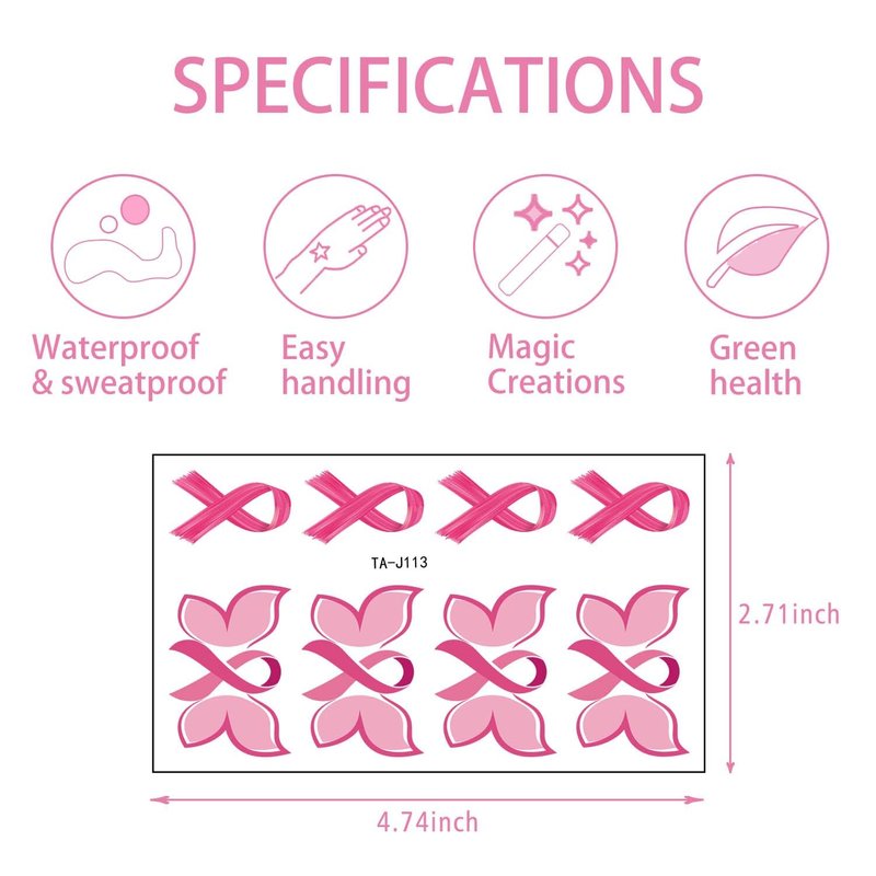 - 𝐑𝐞𝐦𝐚𝐫𝐤𝐚𝐛𝐥𝐞 𝐄𝐟𝐟𝐞𝐜𝐭:These breast cancer tattoo stickers have been proved to be very effective in publicizing and promoting the cause of breast cancer prevention and treatment. Whether in public or private, as long as you wear these tattoo stickers, you can attract more people's attention and support, and contribute to the cause of breast cancer prevention.