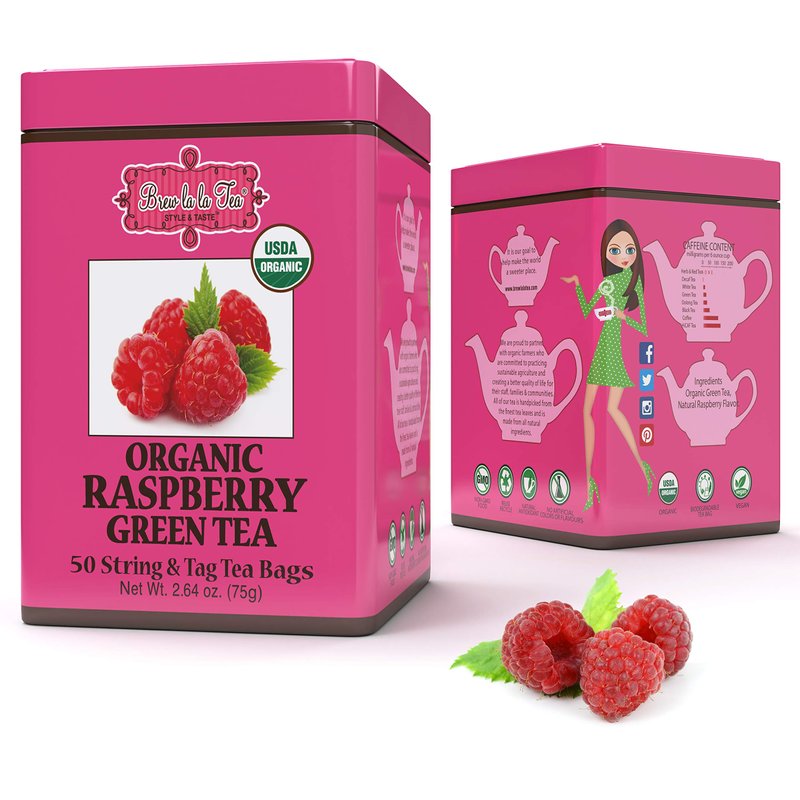 Brew La La Organic Green Tea - Natural Raspberry Flavor - 50 Double Chambered Bags - Low Caffeine Gourmet Tea - Certified Organic - Gluten Free
