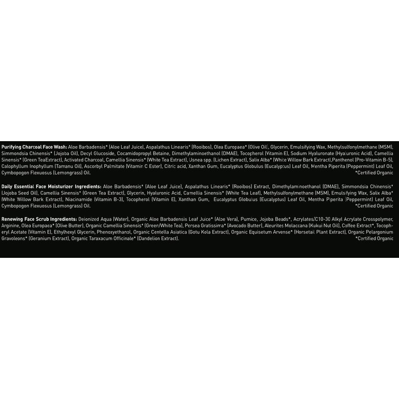 The complete daily skincare routine for men to maintain healthy skin. The three products in this men’s skin care kit work together to deliver a complete skincare routine that gives immediate and noticeable results. Designed for sensitive, dry, and normal skin types. How to Use It: Step 1: Wash your face morning & night with our Purifying Charcoal Face Wash for men to remove facial impurities & oil which prevent a bright, clear complexion. Step 2: Gently exfoliate your skin with our Renewing Face Scrub for men 2 - 3x per week to remove dead skin cells, facial impurities, & unclog pores for a more clear complexion. Step 3: Apply our Daily Essential Face Moisturizer for men. Use in the AM to energize & protect your face. Use at night to firm the skin while you sleep. Made With Powerful, Natural Ingredients: Jojoba Beads & Pumice remove dead skin cells & other impurities from your skin without irritating. Aloe & Hyaluronic Acid: Reduces the appearance of fine lines and prevents future wrinkles. Activated Charcoal: Cleanses the pores of oil & other facial irritants without drying out sensitive skin. These - along with other powerful, natural ingredients - have been scientifically formulated to create the best natural skin care products for men. What Else Should You Know? The men’s skin care products in this men’s skin care set are all natural & organic. They are scented with a refreshing essential oil blend of peppermint, eucalyptus, and lemongrass. Used twice daily, this men’s skin care kit lasts approximately 45 days. All our products contain zero sulfates, parabens, glycols, phthalates, petrochemicals, silicones, PEG’s, sulfates, synthetic fragrances, or gluten. Always vegan, no animal testing, 100% Certified Organic ingredients when possible.