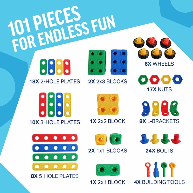 - 101 PIECES - The more the merrier! Our educational toys set has enough blocks, wrenches, moveable wheels, nuts, and bolts for up to 4 / 6 kids at one time.