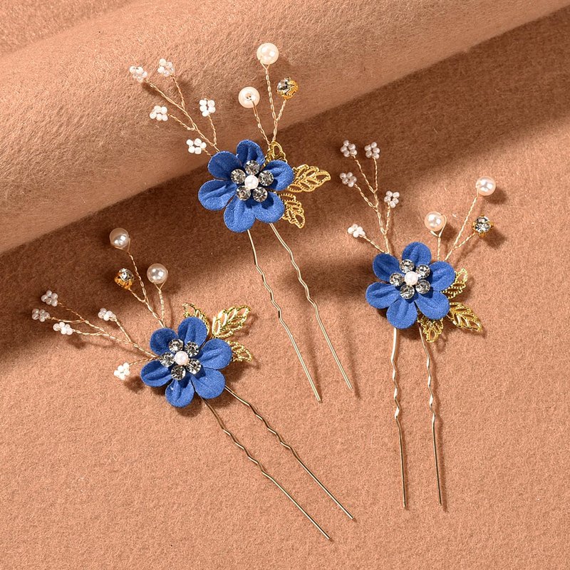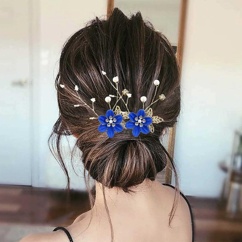 Bridal Hair Combs, 5PCS Wedding Hair Pins Set Crystal Flower Hair Clips Bride Bridesmaid Hair Sides Comb Rhinestone Barrettes, Pearl Flower Hair Pins Hair Accessories for Women Girls (Blue)