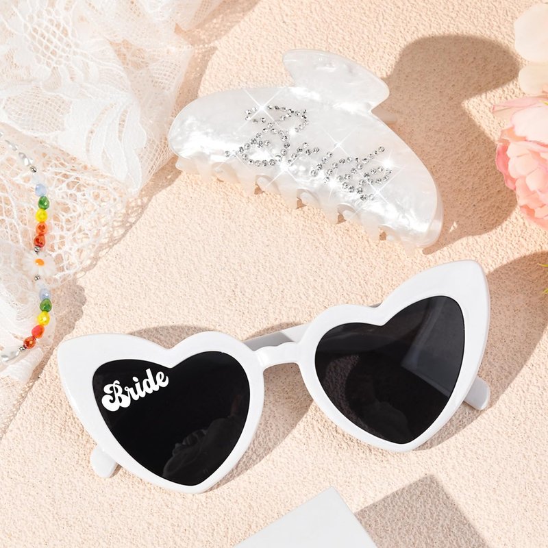 Our Bride Gift Set includes two elegant items: a pair of bride sunglasses, and a white bride claw clip which can nicely meet your wedding use.