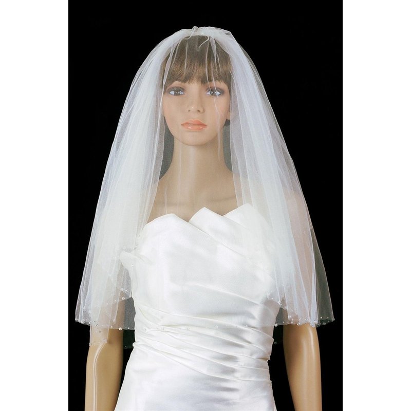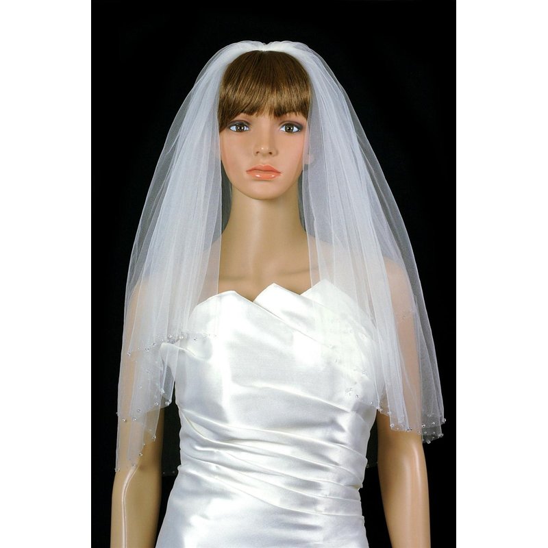 Gorgeous brand new 2 Tiers Elbow Length veil with 72in width in fullness. The edge is beautifully finished with Beaded Edge Trimmed with crystal round beads and seed beads. Center gathered design, this design is created from a circular cut of fabric that is gathered in the center only. Because the edging is not gathered into the comb, veil with design typically lay flatter and more sheer at the comb , the edging hangs beautifully at the bottom of the bridal veil. .The beading is completely hand crafted. The material is soft and flowing, allowing the veil to drape perfectly.The veil has Silver wire comb attached - wire combs are more pliable and versatile, it can be contoured to your head shape and can be pinned if necessary (as opposed to plastic, which is thicker, inflexible and more cumbersome). Due to variations in computer screen settings, the color may appear differently than the actual color of the veil.Please order our color swatch so you can be confident that you are getting the veil color which matches your dress.