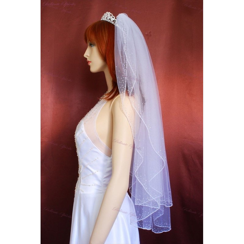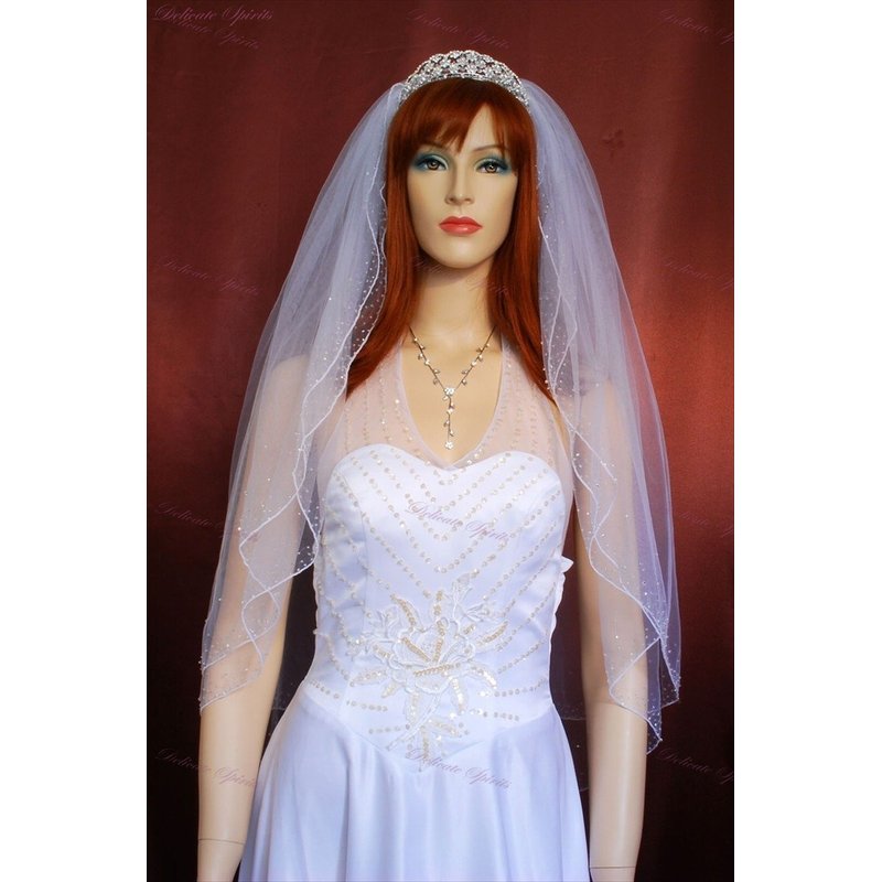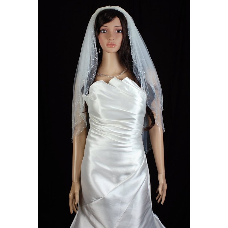Gorgeous brand new 2 Tiers Fingertip Length veil with 72in width in fullness. The edge is beautifully finished with Beaded Edge Trimmed with silver lined bugle beads, white lined rocaille beads, clear seed beads and Swarovski bicone crystals. Standard cut design, the veil is cut in a soft rounded shape, the edging of the veil runs up the sides and is gathered into the comb. .The beading is completely hand crafted. The material is soft and flowing, allowing the veil to drape perfectly.The veil has Silver wire comb attached - wire combs are more pliable and versatile, it can be contoured to your head shape and can be pinned if necessary (as opposed to plastic, which is thicker, inflexible and more cumbersome). Due to variations in computer screen settings, the color may appear differently than the actual color of the veil.Please order our color swatch so you can be confident that you are getting the veil color which matches your dress.