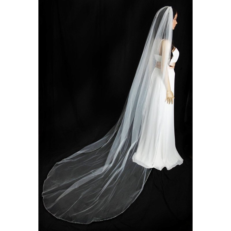 Gorgeous brand new 1 Tier Cathedral Length veil with 72in width in fullness. The edge is beautifully finished with Beaded Edge Trimmed with clear bicone beads and seed beads. Standard cut design, the veil is cut in a soft rounded shape, the edging of the veil runs up the sides and is gathered into the comb. .The beading is completely hand crafted. The material is soft and flowing, allowing the veil to drape perfectly.The veil has Silver wire comb attached - wire combs are more pliable and versatile, it can be contoured to your head shape and can be pinned if necessary (as opposed to plastic, which is thicker, inflexible and more cumbersome). Due to variations in computer screen settings, the color may appear differently than the actual color of the veil.Please order our color swatch so you can be confident that you are getting the veil color which matches your dress.