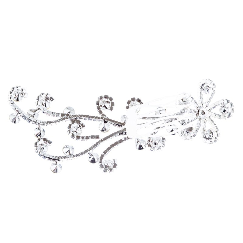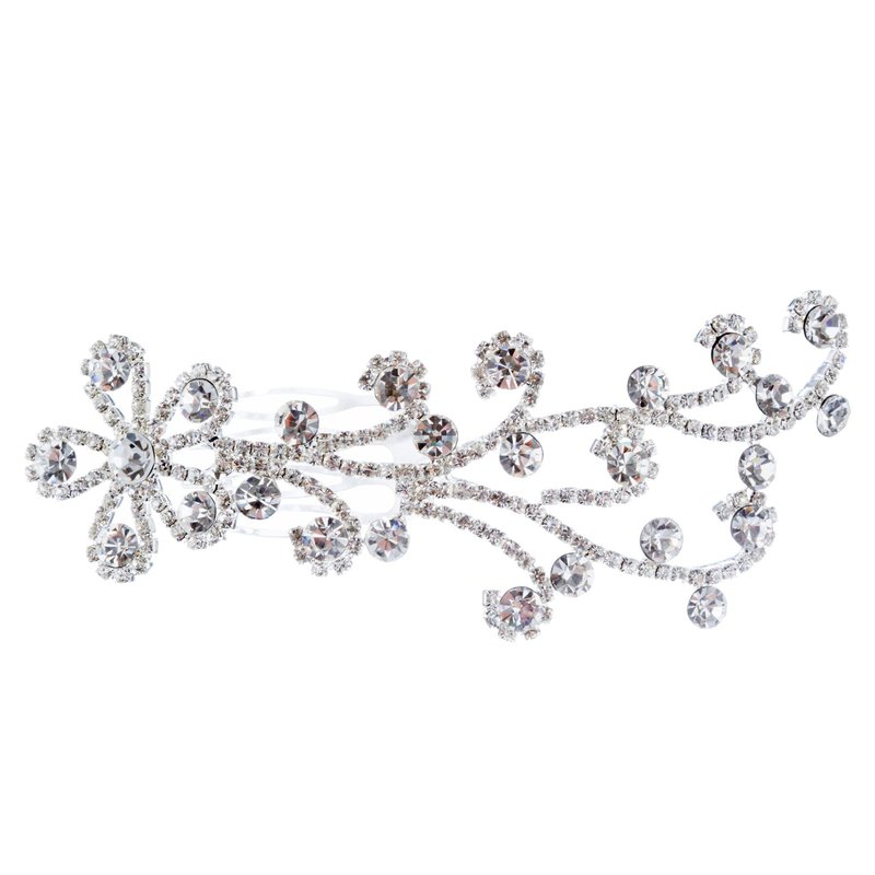 This captivating rhinestone floral hair comb adds a touch of simple elegance to any bridal or prom hairstyle. Embellished with sparkling stones, the design mimics delicate florals and swirling vines, perfect for a chic, romantic addition to your special occasion wear. It's the ideal accessory for a bride or prom attendee who desires a blend of sophistication and subtle glamour.