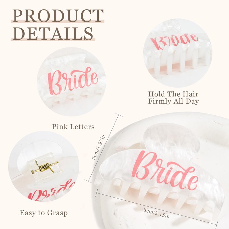 - Bride clip: Pink "Bride" logo and high quality acrylic material - this accessory is a bride-to-be's! Clip in the hair, let everyone attention!