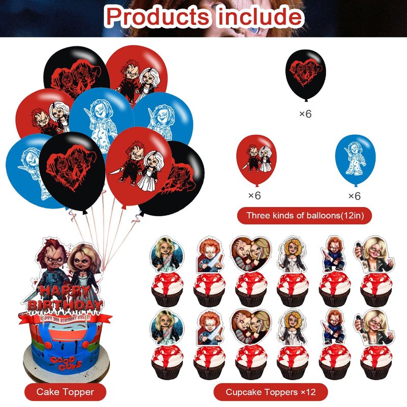 - PACKAGE INCLUDING: Look No Further! 4-IN-1. Unique Cake Topper, 18Pcs Latex Balloons, Happy Birthday Banner and 12 Pcs Cupcake Toppers.Our Complete Set of Bride of Chucky Birthday Party Supplies Will Add Amazing to You, Your Family And Friends