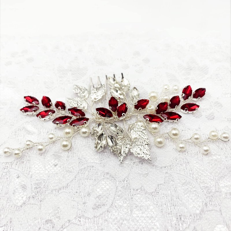 Bride Wedding Hair Comb Crystal Rhinestone Pearls Silver Leaf Hair Piece Accessories for Women Girls Homecoming Party (Wine Red)