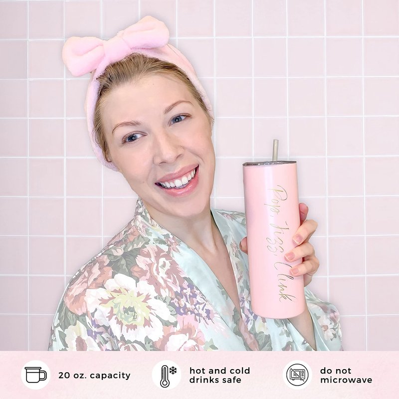 - Bridesmaid Gift Set Includes 1 Box, 1 Claw clip, 1 Metal Tumbler, 1 Fabric Headband, 8 Label Stickers